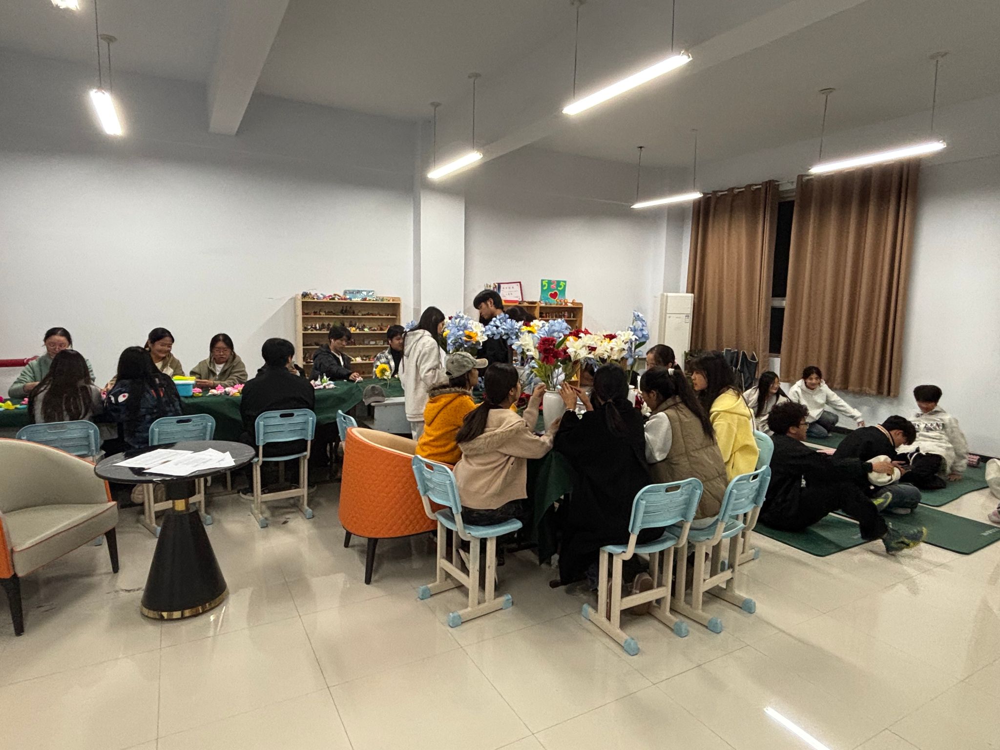 本次活动以“通过视、嗅、触、动四种感官通道,为压力找到出口,为身心充满电量”为主题,设置了视觉区、嗅觉区、触觉区和舒缓运动冥想体验区四个功能区域。学生在引导下依次参与各区域体验,通过插花表达、精油闻嗅、减压玩具触摸、瑜伽伸展与冥想放松等多种方式,逐步释放压力、提升身心觉察力。
