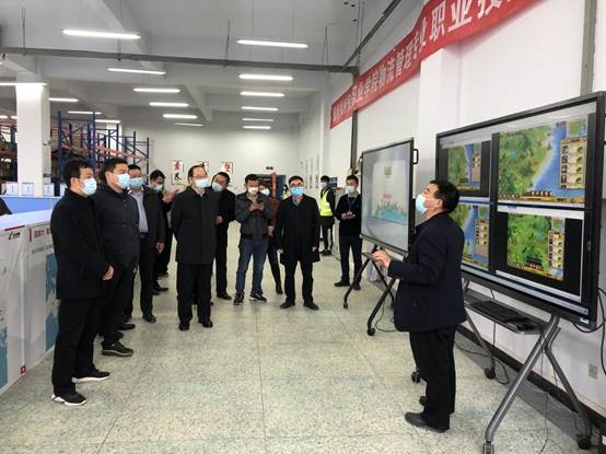 校长文广轩、副校长张建军与特邀嘉宾听取现代物流运输运营能力赛事介绍