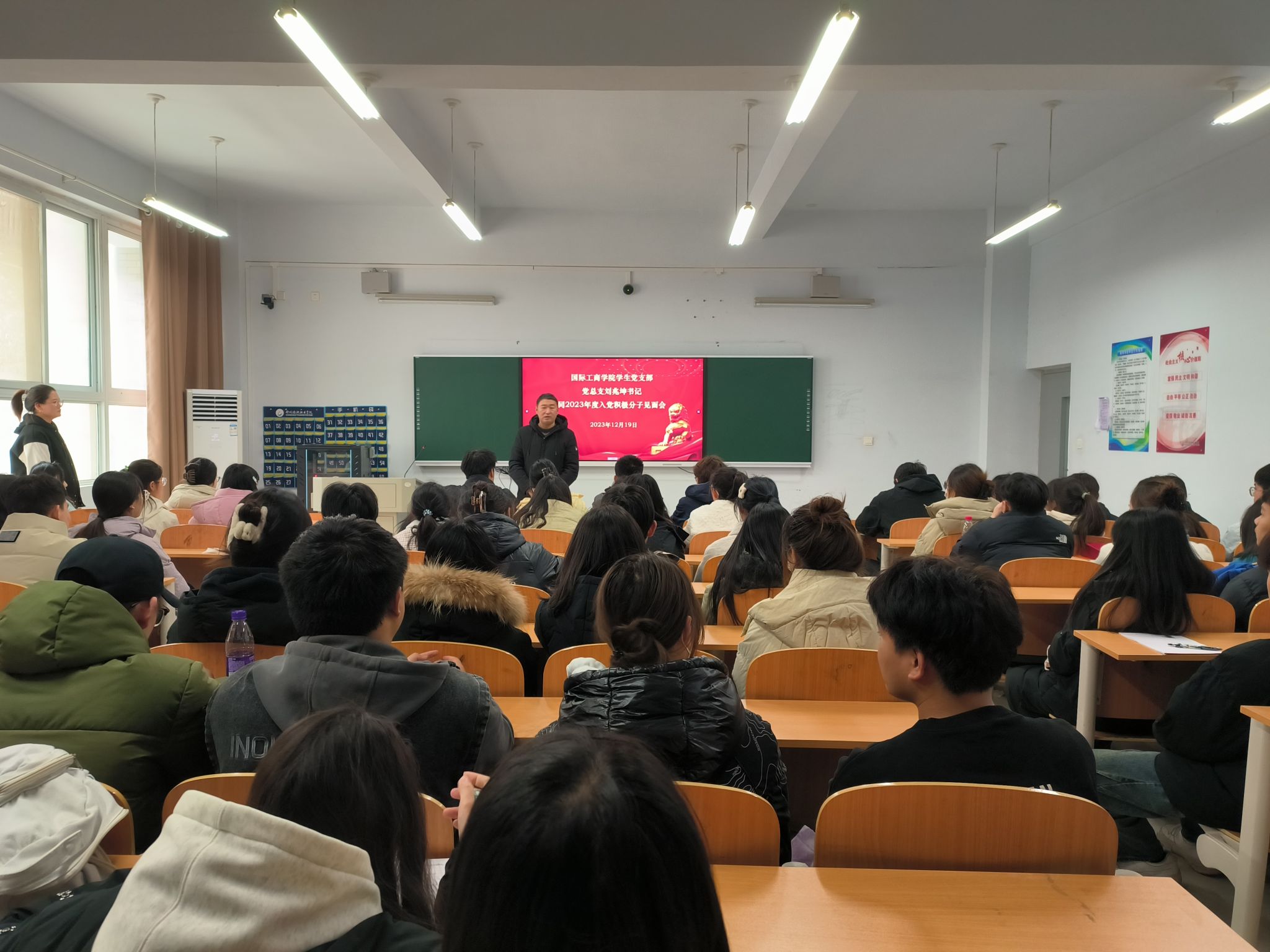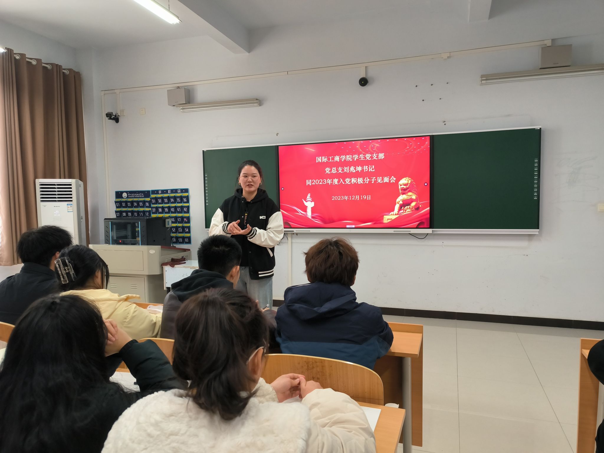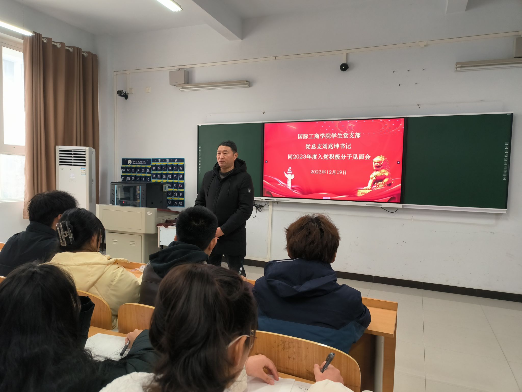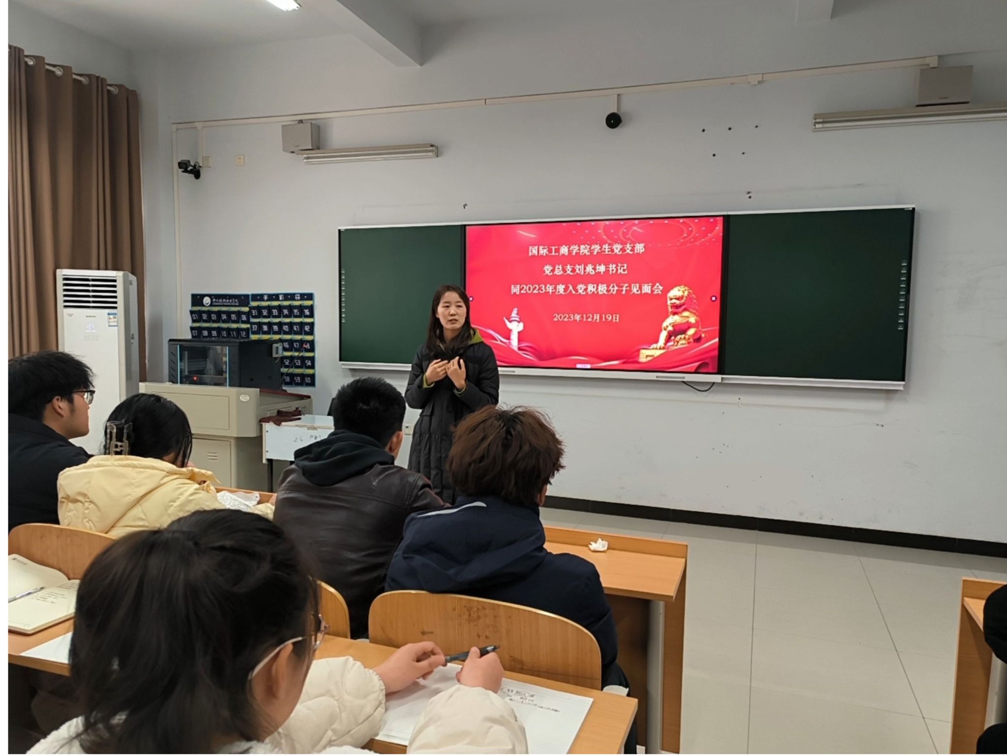 12月19日下午,国际工商学院党总支书记刘兆坤在1B203教室召开同2023年度入党积极分子的见面会。会议由学生党支部书记葛秀丽主持,学生党支部副书记孙文霞、23级全体入党积极分子参会。