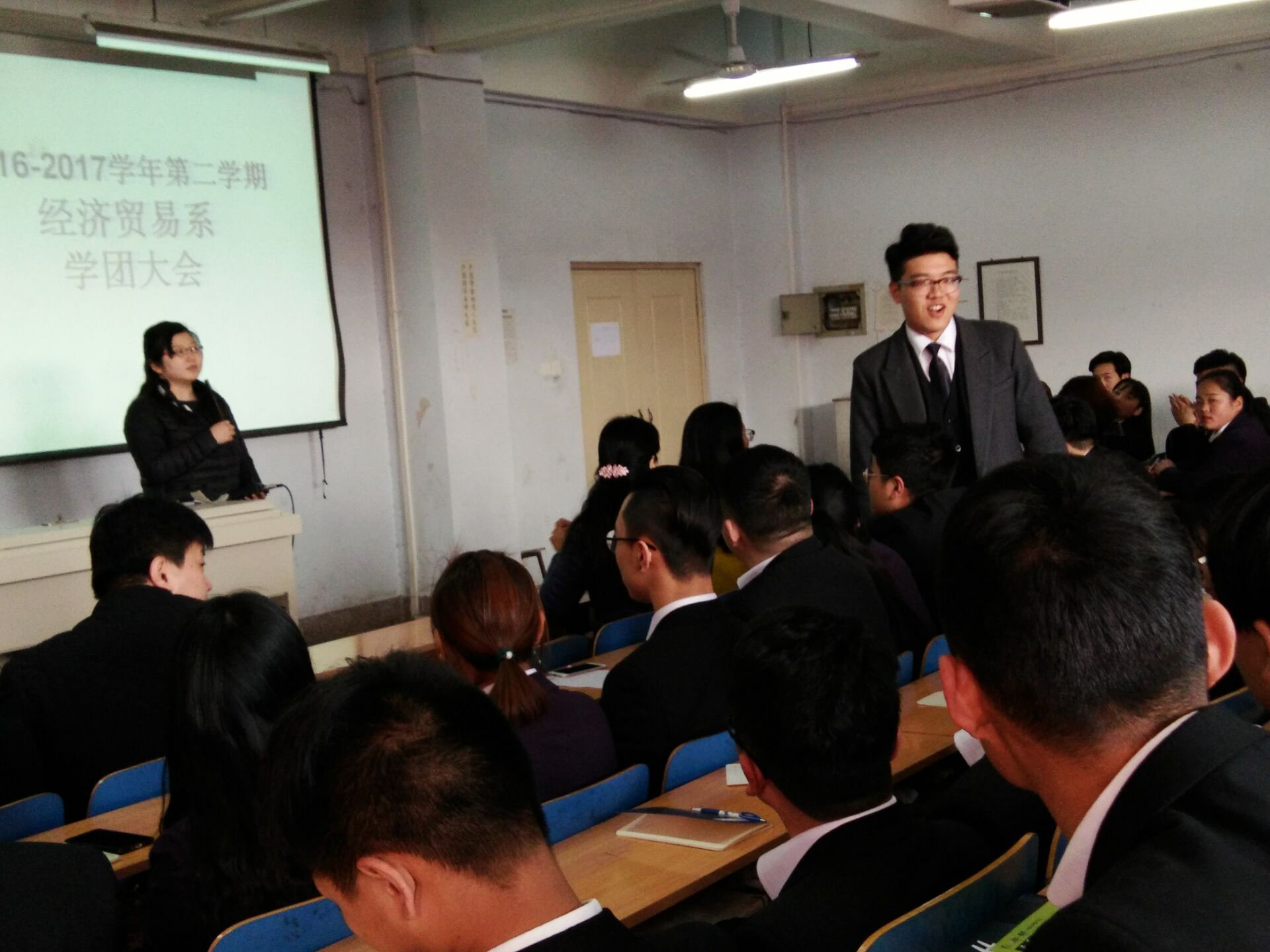 2017年3月8日下午四点十分,经济贸易系在东教学楼三楼南街召开学团例会。本次会议的主题为“团结”,经济贸易系党支部副书记郭崖、经济贸易系团支部书记谢锡莹、各位辅导员以及学生会、团总支全体干部等近六十人参加了此次会议。