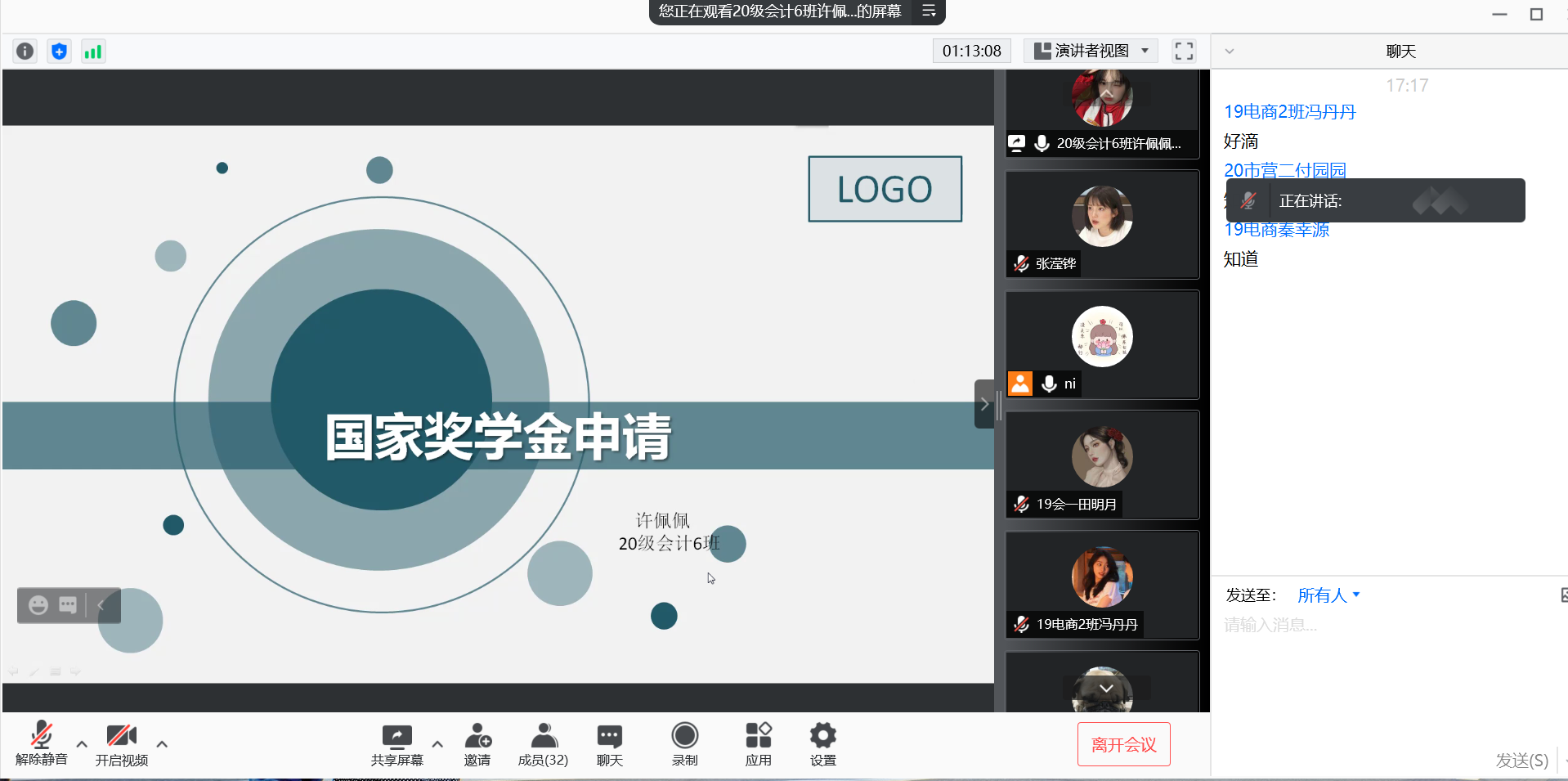 随后,谢锡莹总结了学生的个人展示环节,她指出,21位国奖候选人的学习成绩和综合素质都相当优异,他们在学生工作、社会实践、集体活动等方面的表现十分出色,充分展示了我院优秀学生的风采。