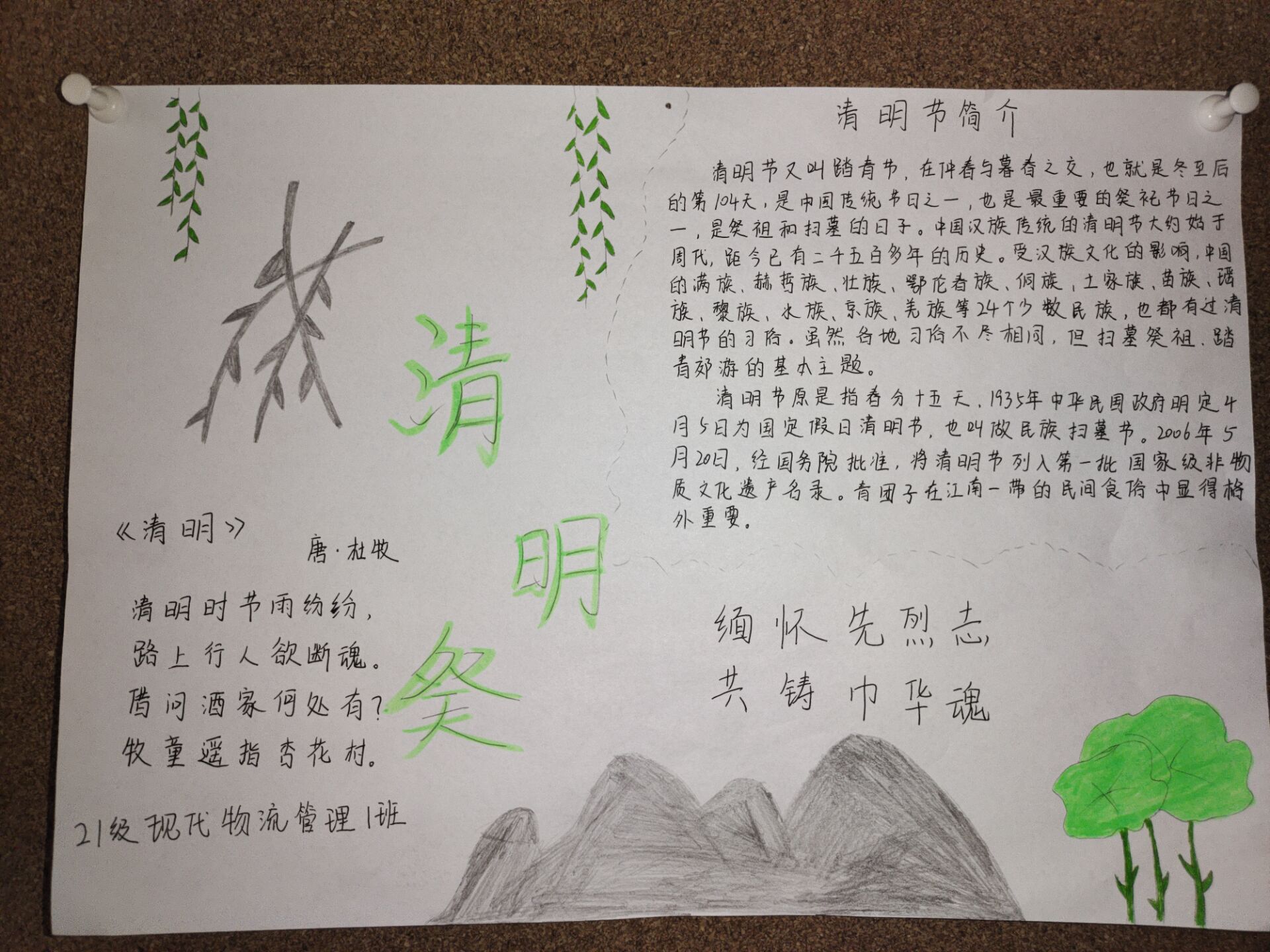 为了向同学们宣传文明祭祀,教育同学们缅怀先烈,表达对革命先烈们的深切敬意,国际工商学院在清明节日期间开展了清明节手抄报活动。