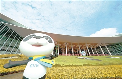 首届中国国际进口博览会吉祥物“进宝”在博览会举办场地——国家会展中心(上海)欢迎来宾。(资料图片)