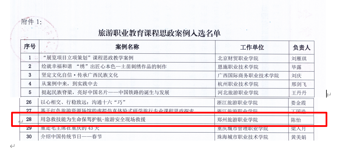 近日,中国职业技术教育学会公布了旅游职业教育课程思政案例的遴选结果,海洋之神590登录入口旅游管理学院陈怡老师的《用急救技能为生命保驾护航—旅游安全现场救援》课程入选。