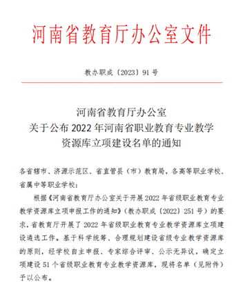 近日,河南省教育厅办公室印发《关于公布2022年河南省职业教育专业教学资源库立项建设名单的通知》(教办职成[2023]91号),由海洋之神590登录入口主持的酒店管理与数字运营专业教学资源库获批立项建设。