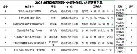 根据《河南省教育厅办公室关于开展2023年河南省高等职业教育教学竞赛活动的通知》(教办职成〔2023〕123号),河南省教育厅组织举办了2023年河南省高等职业教育教学能力大赛。经学校比赛、省级网络评审、现场决赛等环节,共评出一等奖69个、二等奖108个、三等奖133个。