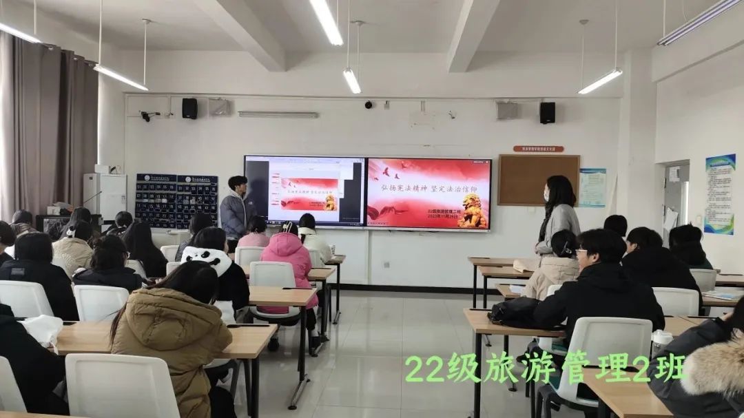 为强化学生宪法意识,弘扬宪法精神,坚定法治信仰,11月29日,郑州旅院旅游管理学院组织召开“弘扬宪法精神,坚定法治信仰”主题班会,班会由各班班主任主持。
