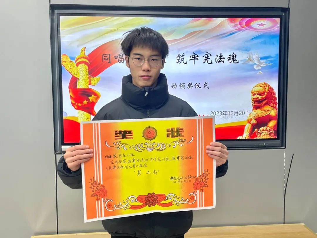 经过一段时间的练习,同学们在12月19日提交了参赛视频。视频中,同学们以饱满的热情和生动的表现,诠释了宪法的精神和内涵。他们用歌声讲述宪法的故事,用通俗易懂的方式让大家真正的认识宪法、尊崇宪法、学习宪法、遵守宪法、传唱宪法,通过歌曲传唱的形式加深学生对宪法的认识和理解,弘扬宪法精神。最后,经过评委们的认真评审和比较,最终评选出了优胜班级。12月21日,颁奖典礼在学院大学生活动中心隆重举行,获奖者们手捧奖杯和证书,脸上洋溢着喜悦和自豪。他们的表现不仅赢得了评委们的高度评价,也赢得了同学们的热烈掌声和喝彩。