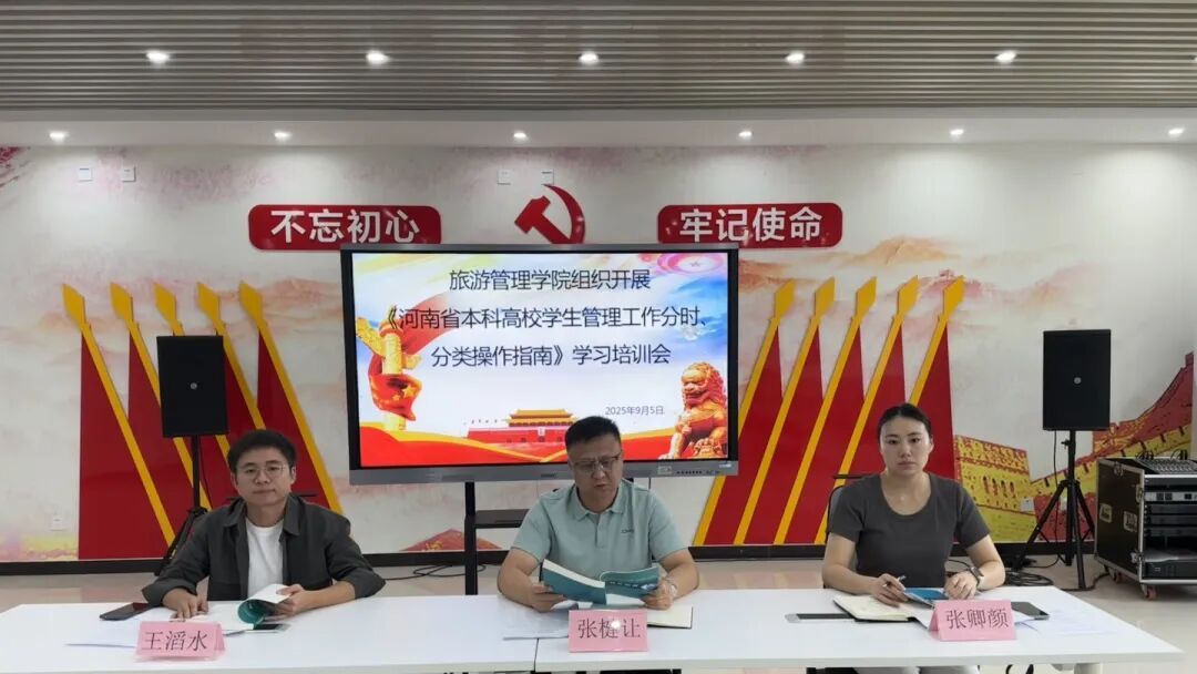 会上,张楗让首先强调了学习《操作指南》的重要性,指出其是落实省教育厅“精准化学生管理” 要求的关键,需结合旅游管理专业特色 —— 如学生实习实训分散、跨地域学习等特点,做好分时分类管理。随后,王滔水围绕《操作指南》中 日常管理、特殊群体帮扶、假期安全管控等核心模块展开解读,结合学院过往学生管理案例,明确不同学年、不同场景下的管理侧重点。张卿颜则针对团学工作提出需将分时分类理念融入活动组织、志愿服务等环节,提升工作精准度等要求。