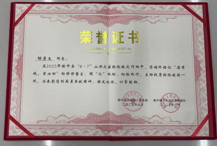 这场与山洪的较量中,邴彦文的身影完美诠释了“青春由磨砺而出彩,人生因奋斗而升华”的真谛,抗洪期间邴彦文由于在抢险救灾中的英勇表现和无私奉献,获得了榆中县退役军人事务局和榆中栖云老兵应急救援队联合颁发的荣誉证书。这份荣誉不仅是对他逆行出征、挺身而出的高度肯定,更生动体现出新时代青年以青春之我、奋斗之我,在党和人民最需要的地方挺膺担当的精神风貌,他用青春行动书写“青春向党、不负人民”的时代答卷,让青春的旗帜在抢险救灾一线高高飘扬。