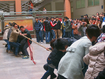 2012年11月28日上午10时,我系开展了一场激动人心的拔河比赛。旅游管理系辅导员戚丁钒老师和康琪老师一起主持了本次联谊比赛,参加比赛的队员分别有11级学生与12级新生。
