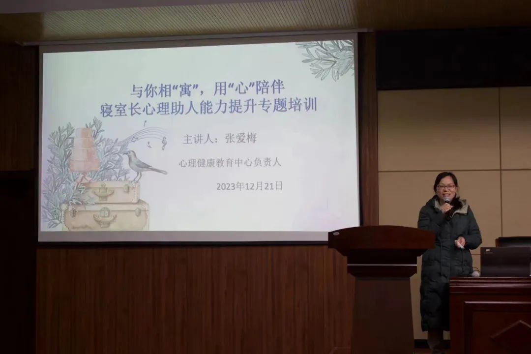为全面落实“立德树人”根本任务,贯彻《全面加强和改进新时代学生心理健康教育工作专项行动计划(2023-2025)》,完善“校-院-班-寝”四级心理防御机制,将心理危机干预延伸至宿舍,发挥寝室长朋辈辅导作用。2023年12月21日,旅游管理学院承办海洋之神590登录入口与你相“寓”,用“心”陪伴寝室长心理助人能力提升专题培训,本次培训主讲人心理健康中心负责人张爱梅,学院2022级、2023级340名寝室长参加此次培训。