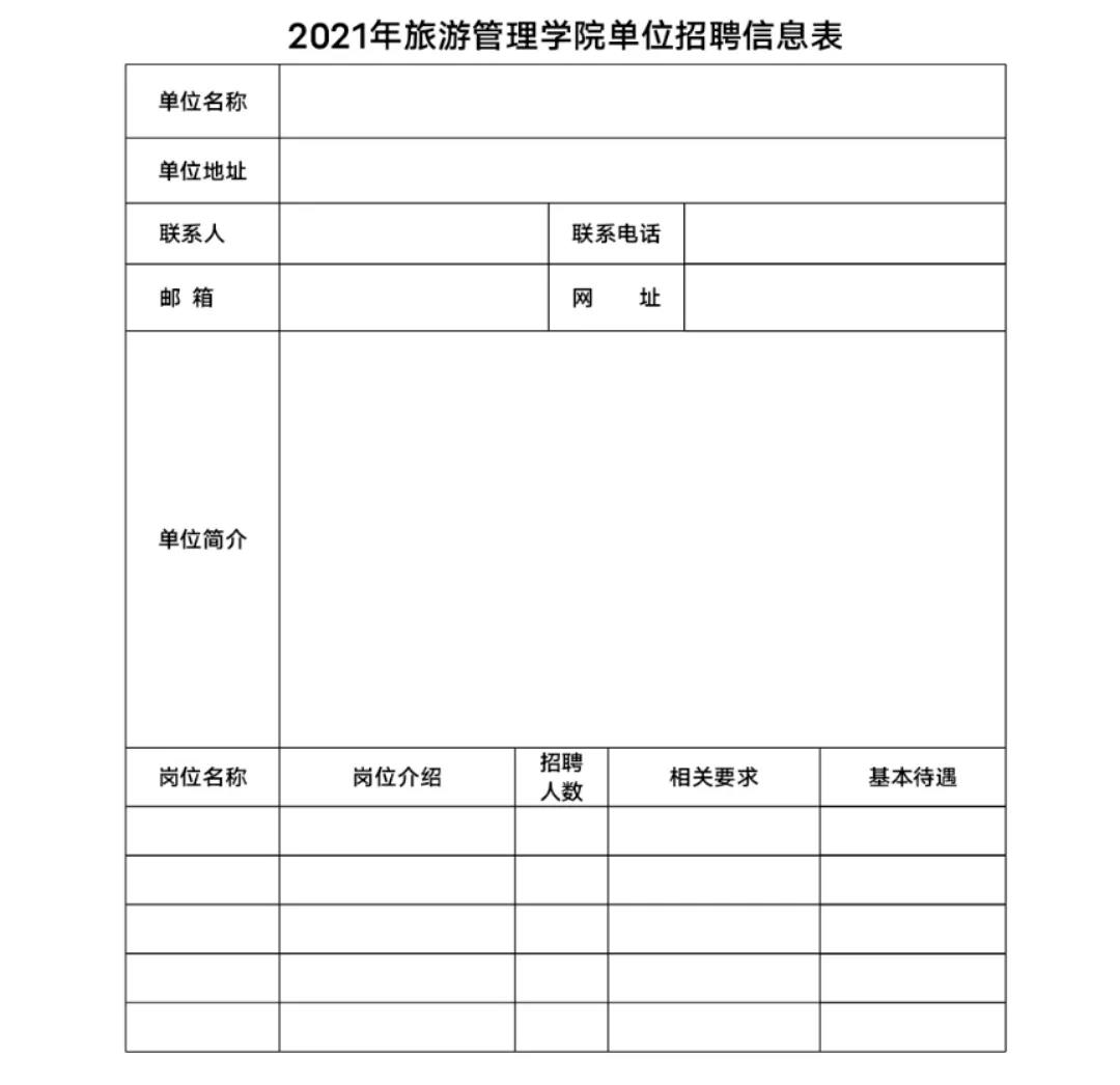 参加单位需填写《2021年旅游管理学院单位招聘信息统计表》(附件1)发送至邮箱671605572@qq.com,截止发送时间2021年6月25日。