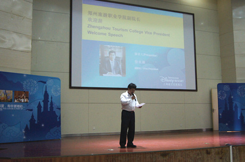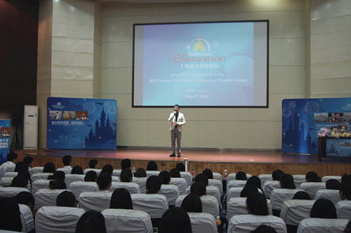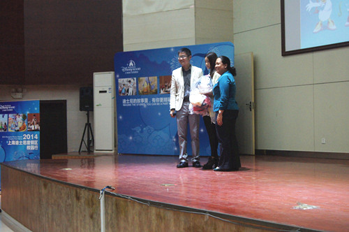 2014年5月8日下午15时,上海迪士尼度假区代表团来我院进行校园招聘宣讲会,出席本次宣讲会的有我院副院长徐永清、上海迪士尼度假区人力资源部几位代表出席本次宣讲会并致辞。本次宣讲会分为三个环节:讲解环节、问答环节、抽奖环节。来自迪士尼的人力资源总监从细节着手,幽默风趣的讲解让同学们对上海迪士尼度假区有了更深的了解,激发了同学们对迪士尼乐园的向往。为了让同学们全面的了解迪士尼,迪士尼的人力总监特意留出时间让同学们提出自己心中的疑问,并一一做出解答。另外,迪士尼方面为同学们准备的具有迪士尼特色的小礼物,与现场同学进行互动,把本次宣讲会的气氛推向高潮。我院副院长徐永清、迪士尼人力资源总监、校园招聘经理分别为获奖同学颁奖并合影留念。整场宣讲会在一片欢快的气氛中结束。
