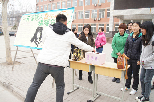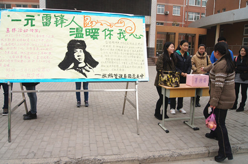 为了服务于常年默默奉献的环卫工人,为他们送去温暖与关爱,旅游管理系特于2014年3月5日12时在西教学楼门前举办“一元雷锋人,温暖你我心”募捐活动。活动过程中,大家踊跃捐款,奉献出自己的爱心。