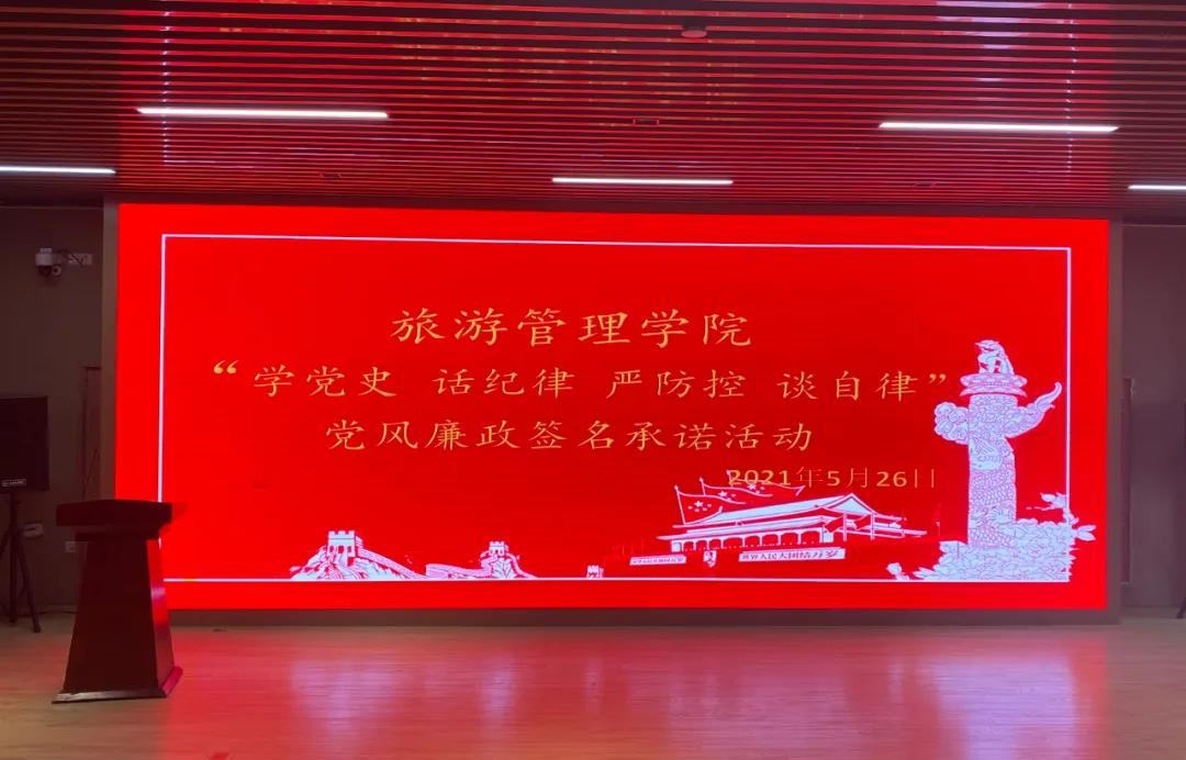 5月26日下午,旅游管理学院“学党史 话纪律 严防控 谈自律”党风廉政签名承诺活动在云景点实训室组织开展。学院全体教师参加。