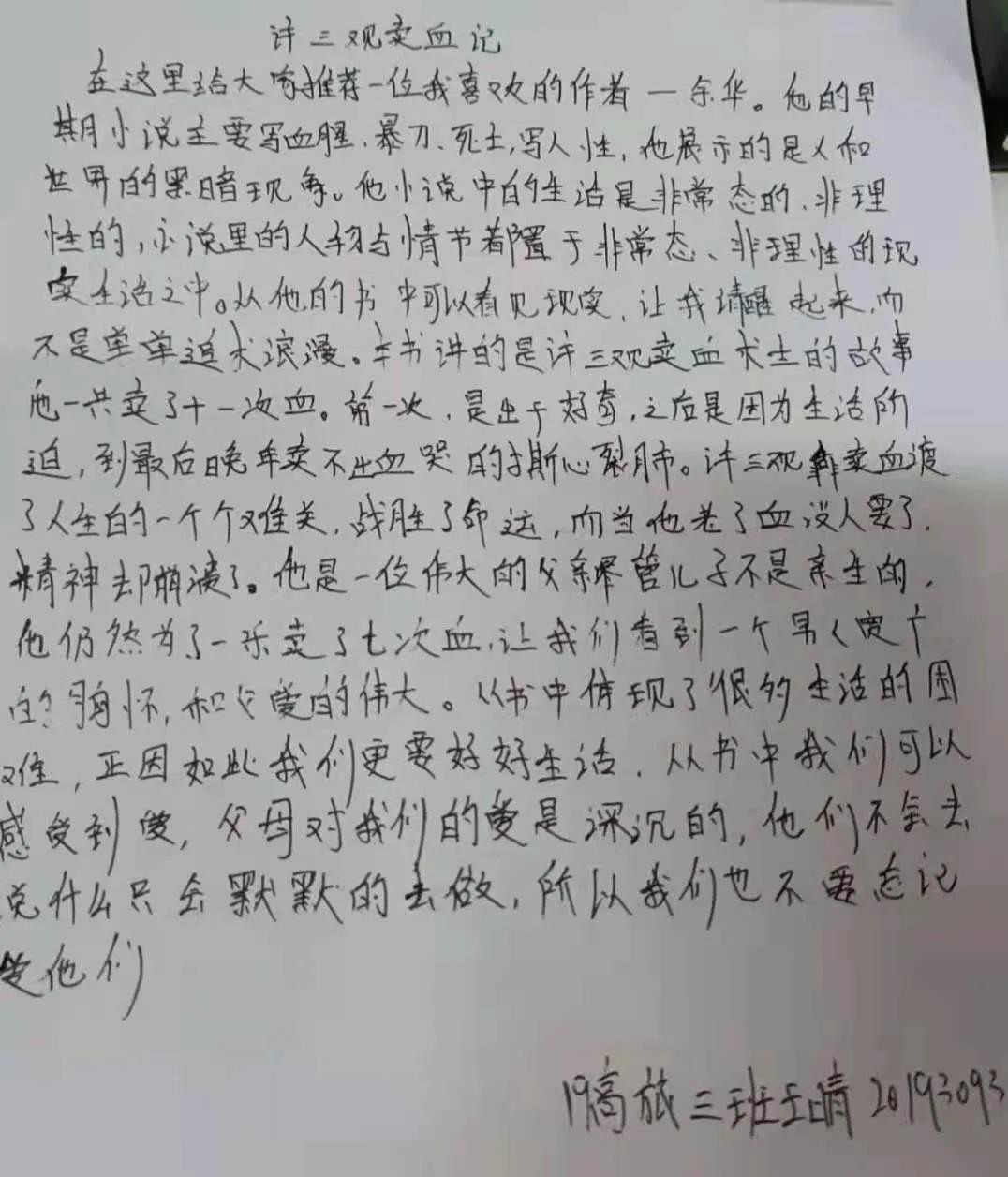 在这里给大家推荐一位我最喜欢的作者——余华。他的早期小说主要写血腥、暴力、死亡,写人性恶,他展示的是人和世界的黑暗现象。他小说中的生活是非常态、非理性的,小说里的人物与情节都置于非常态、非理性的现实生活之中。从他的书中我们可以看见现实,让我清醒起来,而不是单单追求浪漫。这本书讲的是许三观卖血求生存的故事。他一共卖了十一次血。第一次,是出于对卖血的好奇,后来是因为环境所逼、生活所迫的卖血,到最后晚年卖不出血哭的撕心裂肺。许三观靠着卖血渡过了人生的一个个难关,战胜了命运强加给他的惊涛骇浪,而当他老了,知道自己的血再也没有人要时,精神却崩溃了。许三观是一位伟大无私的父亲,尽管一直耿耿于怀最喜欢的儿子一乐不是自己亲生的,他仍然为一乐义无反顾卖了七次血,让我们看到一个男人宽广的胸怀、厚重的父爱和从血肉骨躯里流露出来的淳朴善良 。以小人物的视角,以及他的生存环境窥视整个社会,小人物在大背景下通过卖血的方式来支撑整个家庭,有悲哀,有酸楚,有讽刺,最重要的是有爱!无论时代如何变迁,爱永远是人们心中的主旋律许三观是中国小人物的缩影,从书中我们可以感受到现实的复杂和困难,正因为如此所以我们更加要好好生活,也可以感受到爱,父母对我们的爱是深沉的,他们不会去说什么只会默默的去做,所以我们也不要忘记爱他们。