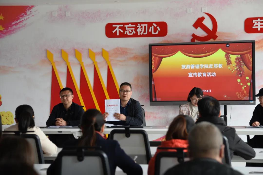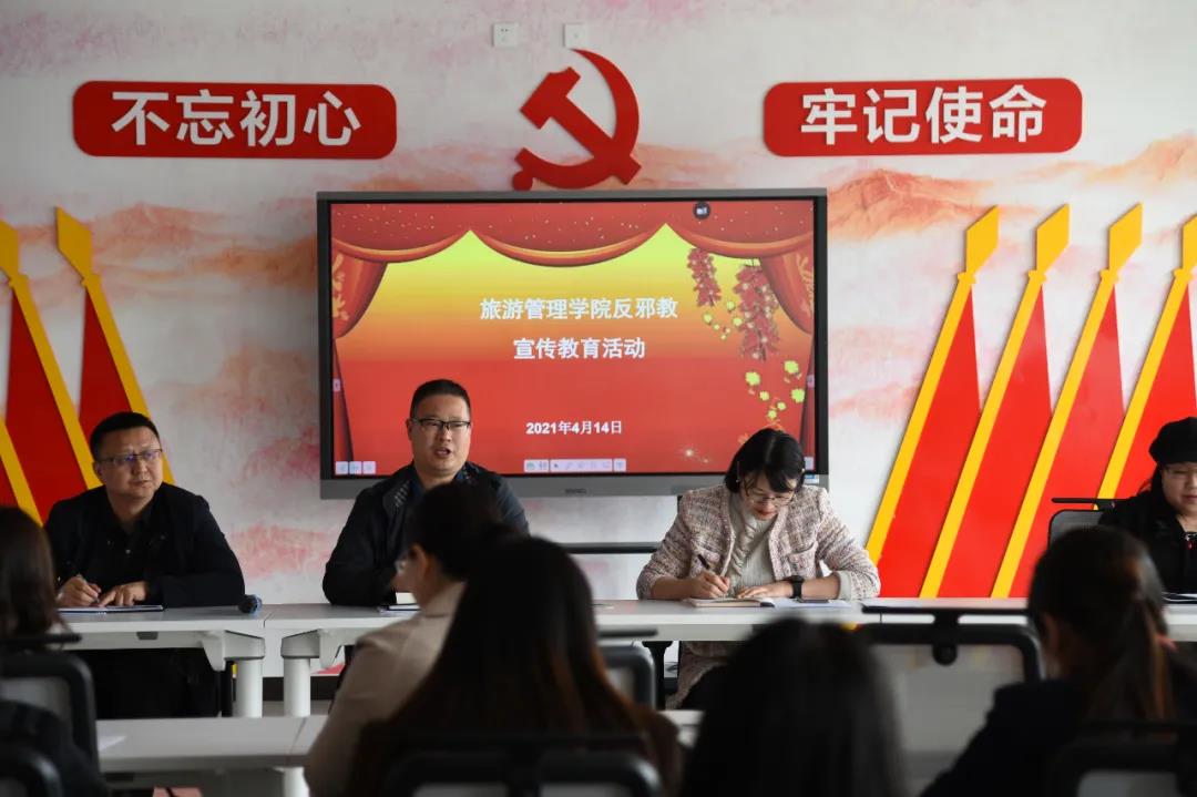 4月14日下午,旅游管理学院“学党史、强信念、跟党走”之反邪教教育宣传主题教育活动在党史文化馆开展。学院党总支书记秦合岗,院长李俊,党总支副书记张楗让,副院长张东月同全院教职工一同参加此次活动。活动由秦合岗主持。