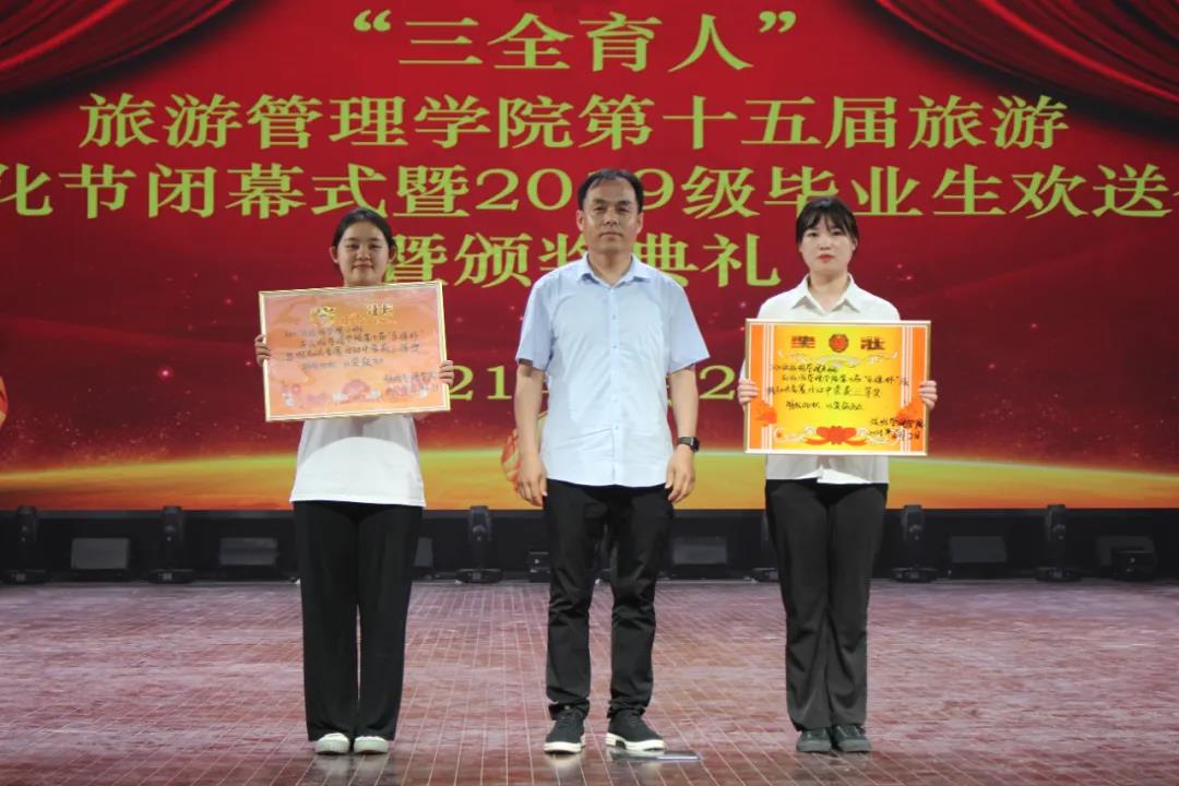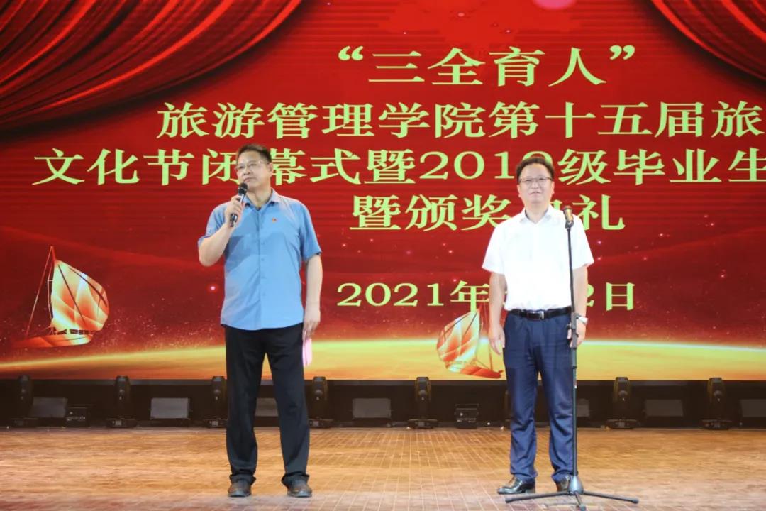 王振超为闭幕式致辞,他代表学校祝贺本届旅游文化节取得圆满成功!同时向组织本届旅游文化节的师生表示衷心的感谢!他指出,十五年的积淀与传承,坚守与创新,担当与奉献,为旅游管理学院锻造了灿若星辰的文化名片,为同学们提供了丰富的精神食粮,是全面践行文化育人、实践育人的重要平台,是校园文化的一道亮丽的风景线,一张响亮的名片。文化节期间举办了专家讲座、班级文明礼仪风采大赛、“乐途杯”旅游知识竞赛等系列活动,深挖德育元素,强化实践培育,把思政教育融于学生日常学习生活中,把社会主义核心价值观融于学生的血脉和灵魂,转化为学生的情感认同、行为习惯和价值取向,实现思政教育与专业教育协同发展。他真诚的希望同学们在今后的学习、工作、生活中,不断感悟经典、传承文化、陶冶情操、塑造灵魂,让正直风度、儒雅气度、艺术修养伴随一生,勇于面对生活中的各种挑战,既做追梦者,又做圆梦人,将实现自我价值和时代发展结合起来,扎扎实实谋事,老老实实做人,将个人的理想与中华民族伟大复兴的中国梦有机结合起来,在新的征途中飞得更高,飞的更远。