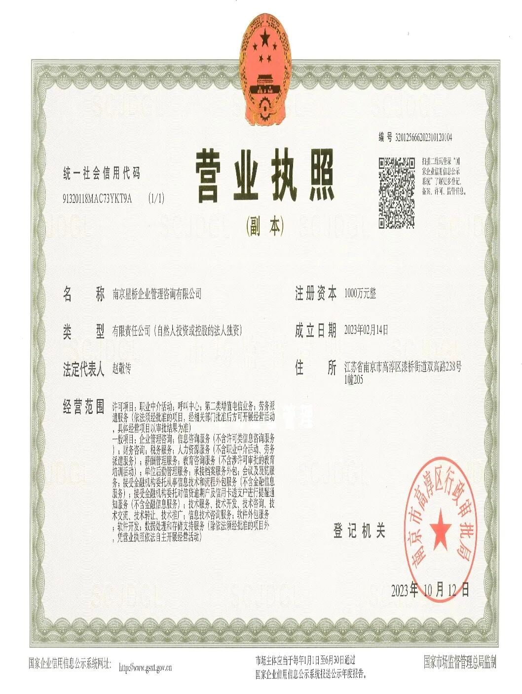 南京星桥企业管理咨询有限公司,成立于 2023年,注册资本 1000 万元, 是苏宁金融全资控股子公司。公司拥有成熟稳定的业务团队,资深专家人员来自 国有大行、TOP 互联网金融平台等机构。公司秉承金融科技赋能金融业务的理念, 通过大数据、云计算、人工智能等技术,全流程、专业高效为客户提供贷后资产 管理服务,现已成为多家银行和大型互联网金融机构的战略合作伙伴。