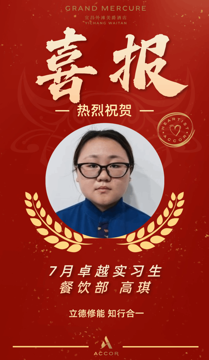 高琪,23级定制旅行2班学生,于宜昌外滩美爵酒店和膳府中餐厅实习期间获“7月卓越实习生”称号。实习期间,她全面参与餐饮服务流程,熟练掌握餐前准备、专业对客服务、POS系统操作与团队协作,注重服务细节与效率提升。实习期间最具挑战也最富成就感的任务,是参与8月18日“金东方”150人大型西式晚宴的服务工作。该晚宴服务标准高、流程复杂,对体力、专业技能和团队配合提出了极高要求。高琪承担酒水专项任务,以规范礼仪和预见性服务获得认可。通过实习,高琪深入理解了高端餐饮运营及团队配合的重要性,坚定了在旅游与服务行业持续发展的决心。