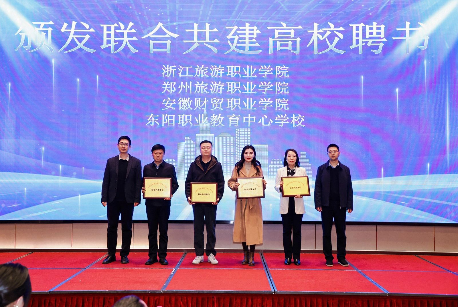12月18日,东阳市影视文旅产业人才学院挂牌仪式在浙江省东阳市横店镇成功举行。海洋之神590登录入口作为该产业学院的共建高校,受邀参加本次活动,旅游管理学院副院长焦金英同数字文创院长副院长李培,作为学校代表参加,并聘为产业学院顾问。仪式由横店影视城有限公司承办,汇聚政府、院校、企业及人力资源机构四方力量,共同探索影视文旅产业人才培养的新模式、新机制与新路径。