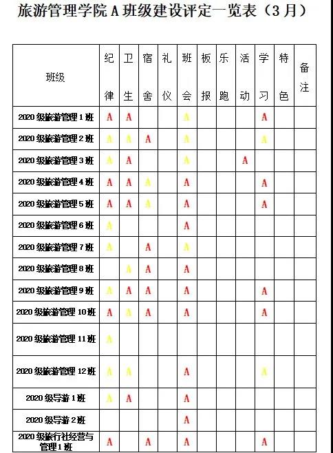 为进一步深化学院“三全育人”综合改革试点工作,贯彻学院“三全育人”工作要求,实现全方位育人。全面促进学生“三素养”教育不断提升,坚持立德树人,把培育和践行社会主义核心价值观落到实处;为培养学生的责任感、荣誉感、合作意识、奋斗意识和竞争意识,激发学生进取心,坚持以学生为本,把正能量融入学生教育、管理和服务的全过程。经研究,结合校院实际,参照A级景区评定规则,实施A级班级建设评定标准,由以往的上墙授牌转变为每月用微信公众号的方式推送,使学生学有榜样、赶有方向、比有对手、追有目标,为校院的可持续发展注入新动力!