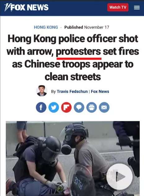 2019年11月17日,福克斯新闻用“protesters”代表用弓箭射穿香港警察小腿的暴徒