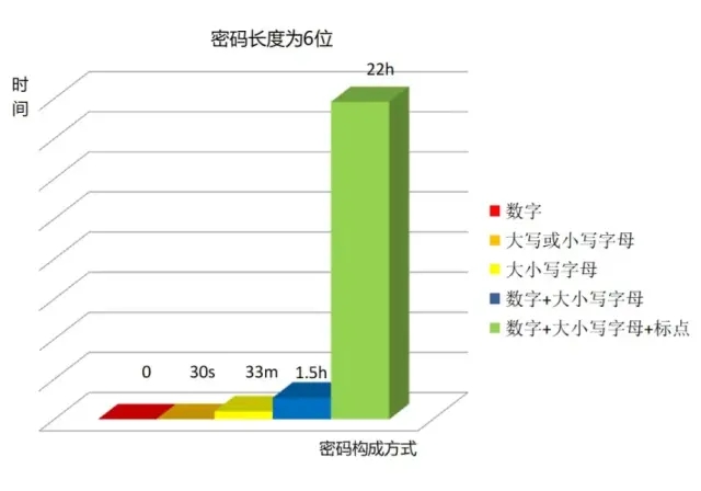 可能有些用户认为把自己的口令设置的长一些,应该比较安全,但其实结果并不是这样的。口令中可以包含数字、字母和特殊符号,当这些字符进行不同的组合方式时,破解的难易程度便不同。如下图所示,破解使用纯数字或纯字母形成的口令非常容易。用户口令最好由字母、数字和符号混合组成,并且至少要达到8位的长度。