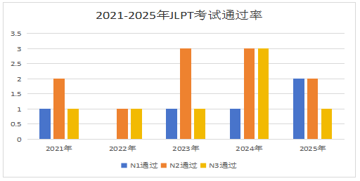 JLPT日本语能力测试(即The Japanese-Language Proficiency Test)是对日本国内及海外以母语非日语学习者为对象,进行日语能力测试和认定。这项考试被认为是日语届的托福考试,含金量很高,证书获取率逐年提高。2021年7月至2024年12月间,N1、N2、N3过级情况柱图,如下: