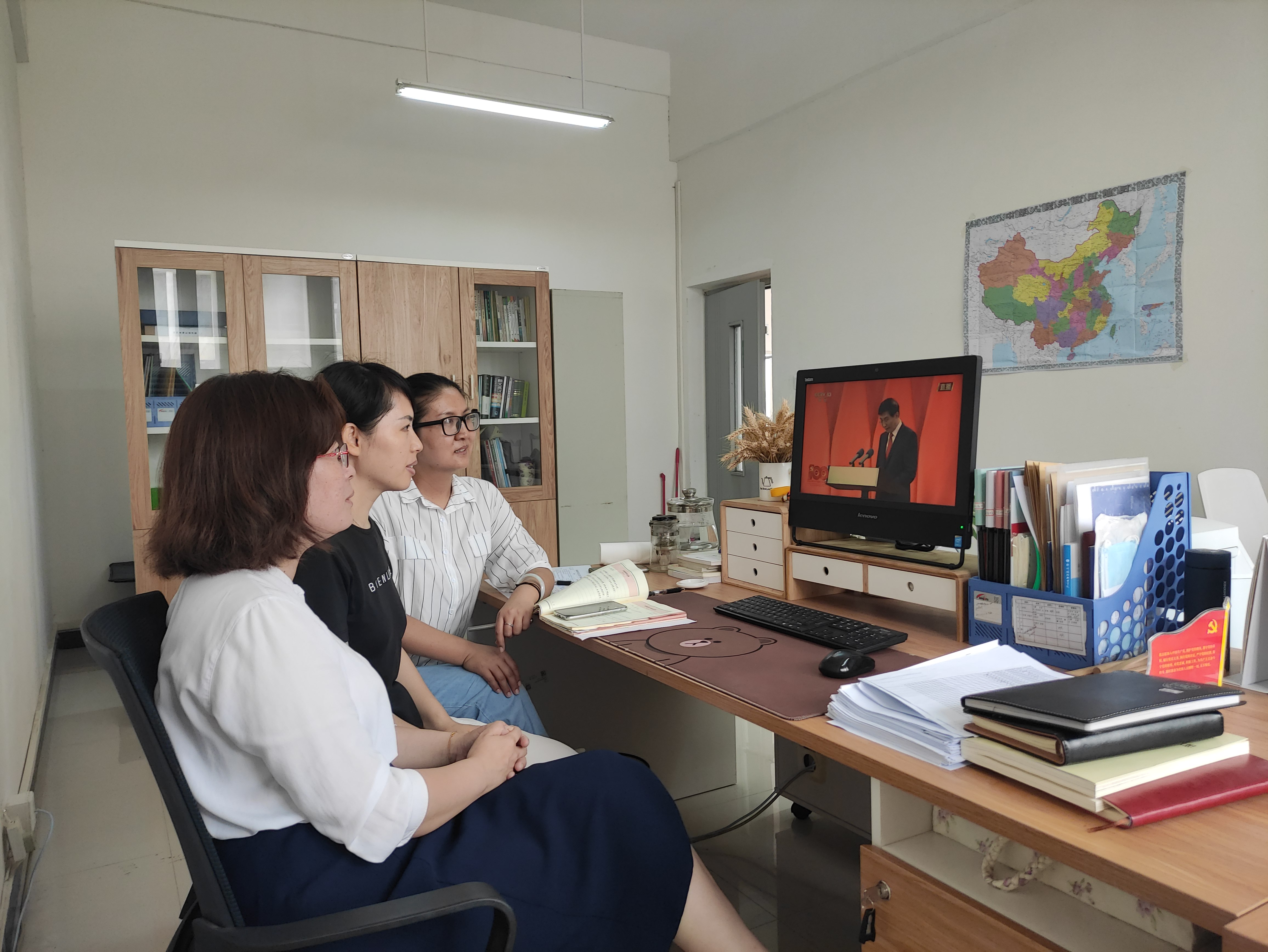 在岗老师们在办公室电脑上通过人民网直播收看,19级实习生的送队老师在路途中通过央视新闻、学习强国等直播平台收看授勋仪式。