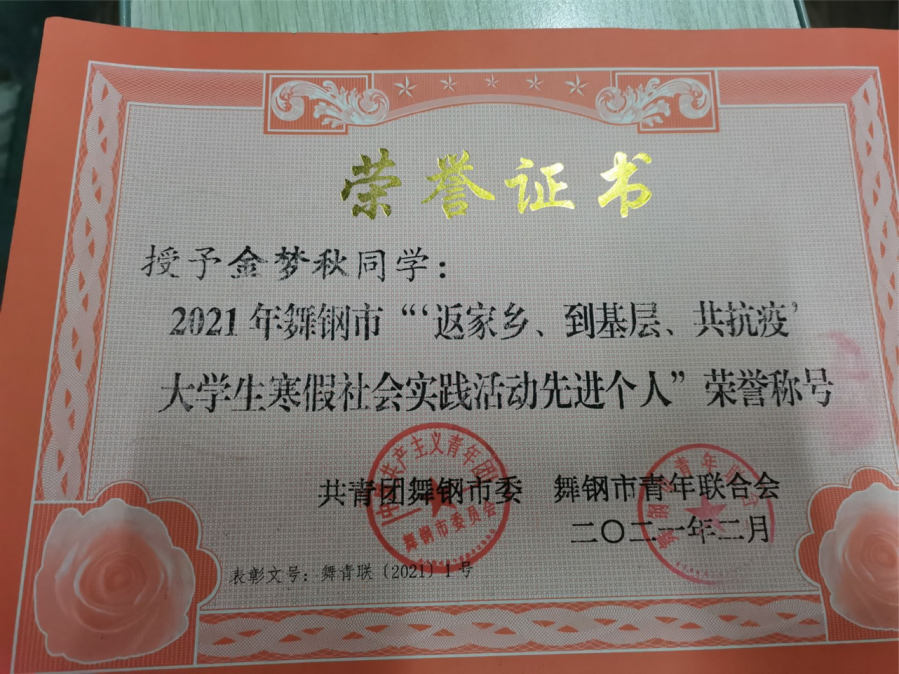 20级商务英语1班金梦秋同学,在我院组织开展返乡大学生向社区(村)报到活动后,积极向舞钢市市委报到积极参加志愿服务并获得2021年舞钢市“大学生寒假社会实践活动先进个人”荣誉称号。