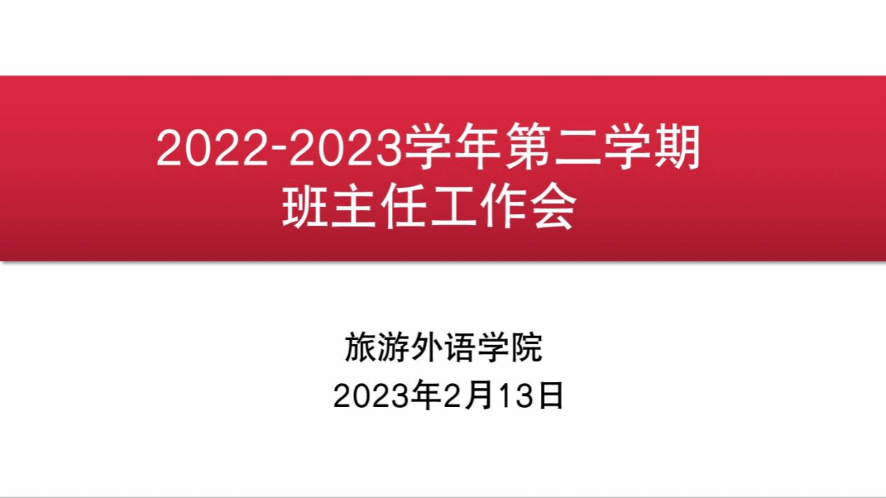 2023年2月13日下午,旅游外语学院在线上召开新学期第一次班主任工作会。党总支书记白娜、团总支书记刘晓丹及全体班主任参加会议。