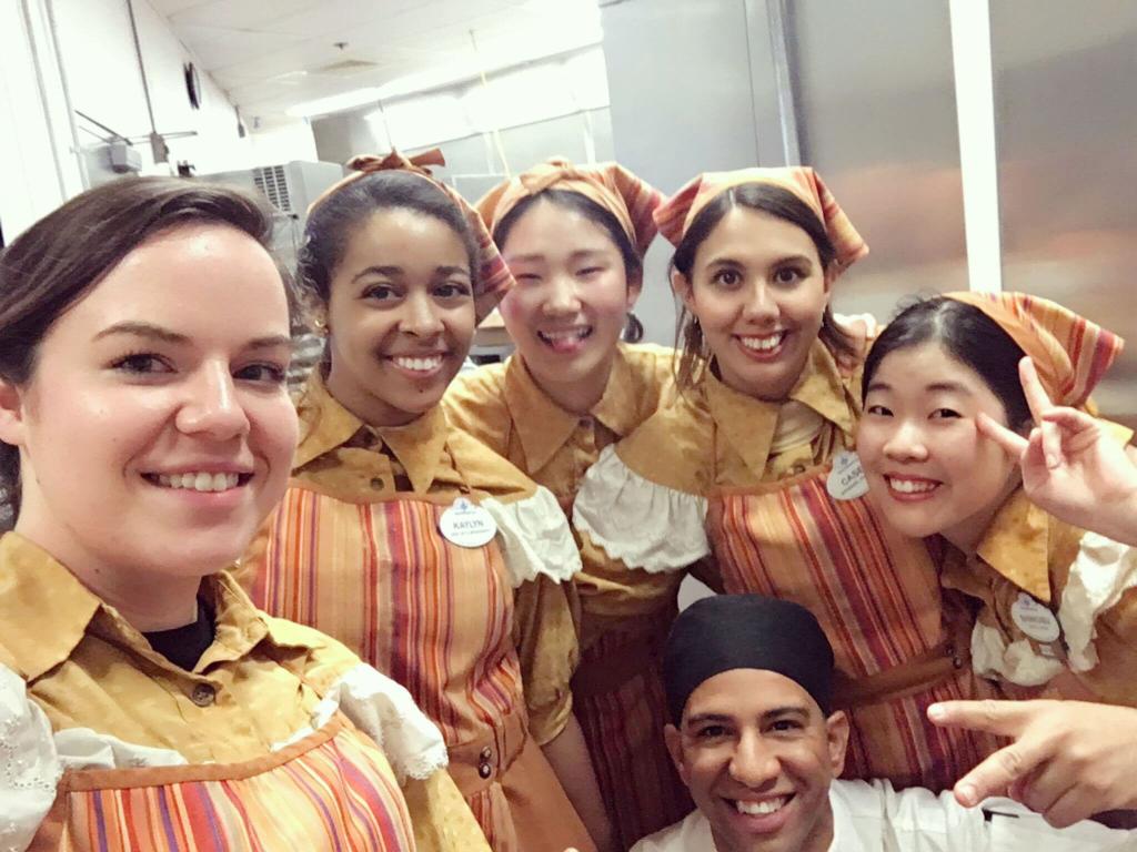 在迪士尼大学,经过为期一周左右的岗前培训,学生便戴上自己独特的名签和米奇帽,开启在餐饮(Food & Beverage)、商品(Merchandise)、园区(Attractions)等不同部门的工作。工作伊始,部分学生还有些手忙脚乱,不同地区的英语,不同的工作环境,不同的工作思路,都是他们的一道道关卡。但迪士尼友好的上司和同事,师傅带徒弟的模式,让学生很快熟悉并胜任自己的工作岗位,越来越得心应手。