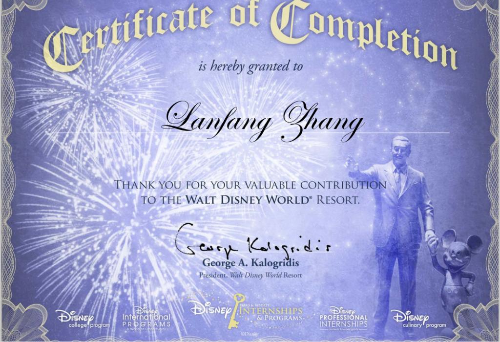 2017年1月,项目即将结束的时候,迪士尼为我们的实习生召开了毕业典礼,并颁发了一份沉甸甸的实习证书。