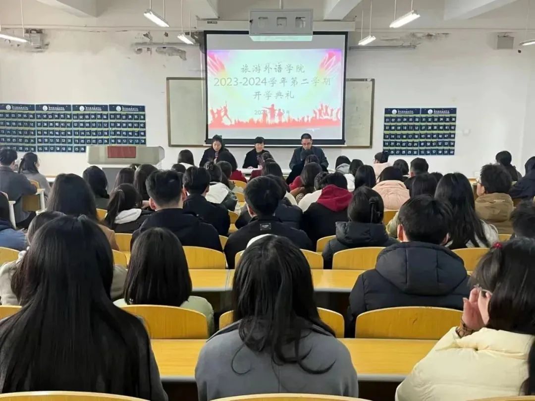 3月3日,旅游外语学院在清源楼211教室举行2023-2024学年第二学期开学典礼。旅游外语学院院长张贺玲、党总支书记肖磊出席,全体专兼职辅导员、学生代表参加开学典礼。团总支书记刘晓丹主持。