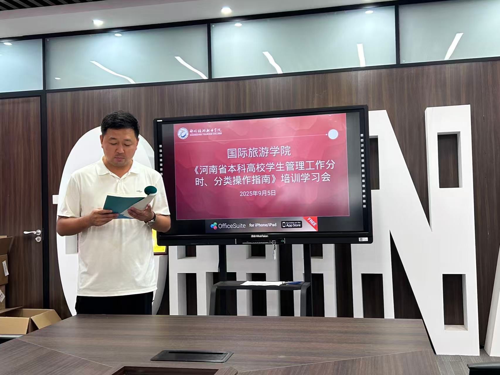 为落实河南省本科高校学生管理工作要求,提升规范化管理能力,国际旅游学院于9月5日在党员活动室召开《河南省本科高校学生管理工作分时、分类操作指南》培训学习会。学院党总支书记肖磊、团总支书记刘晓丹、学工办代主任沈晋旭及全体辅导员参会。