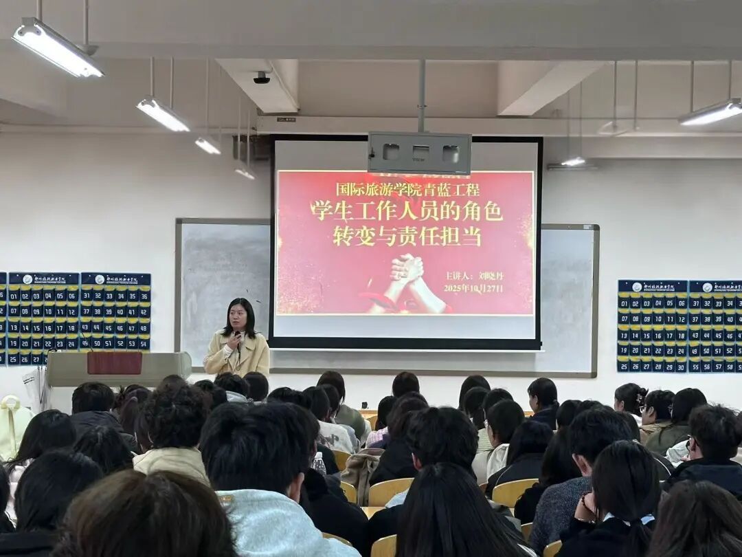 为强化学生工作人员的责任担当与引领作用,10月27日,国际旅游学院于清源楼211教室举办“学生工作人员的角色转变与责任担当”主题培训。本次培训由学院团总支书记刘晓丹主讲,标志着学院2025-2026学年“青蓝工程”学生工作人员系列培训正式启动。