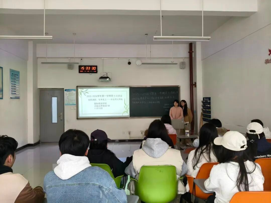 为切实增强学生消防安全意识,提高应急避险与自救互救能力,11月10日,国际旅游学院在清源楼组织各班召开了“全民消防、生命至上——安全用火用电”主题班会,扎实推进校园安全教育工作。