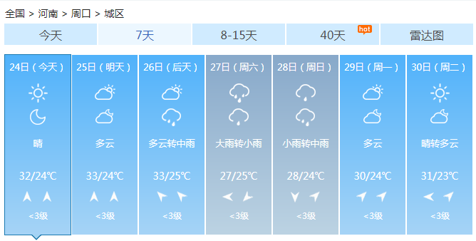 明天白天,北部多云,其它地区晴天间多云。傍晚到夜里,北部多云到阴天,部分地区有阵雨、雷阵雨;其它地区晴天间多云。26日白天,全省多云转阴天,下午南部转阵雨、雷阵雨。26日夜里到27日,全省阴天,大部分地区有小到中雨,其中中东部部分地区有大到暴雨,局地大暴雨并伴有短时强降水、雷暴大风等强对流天气。
