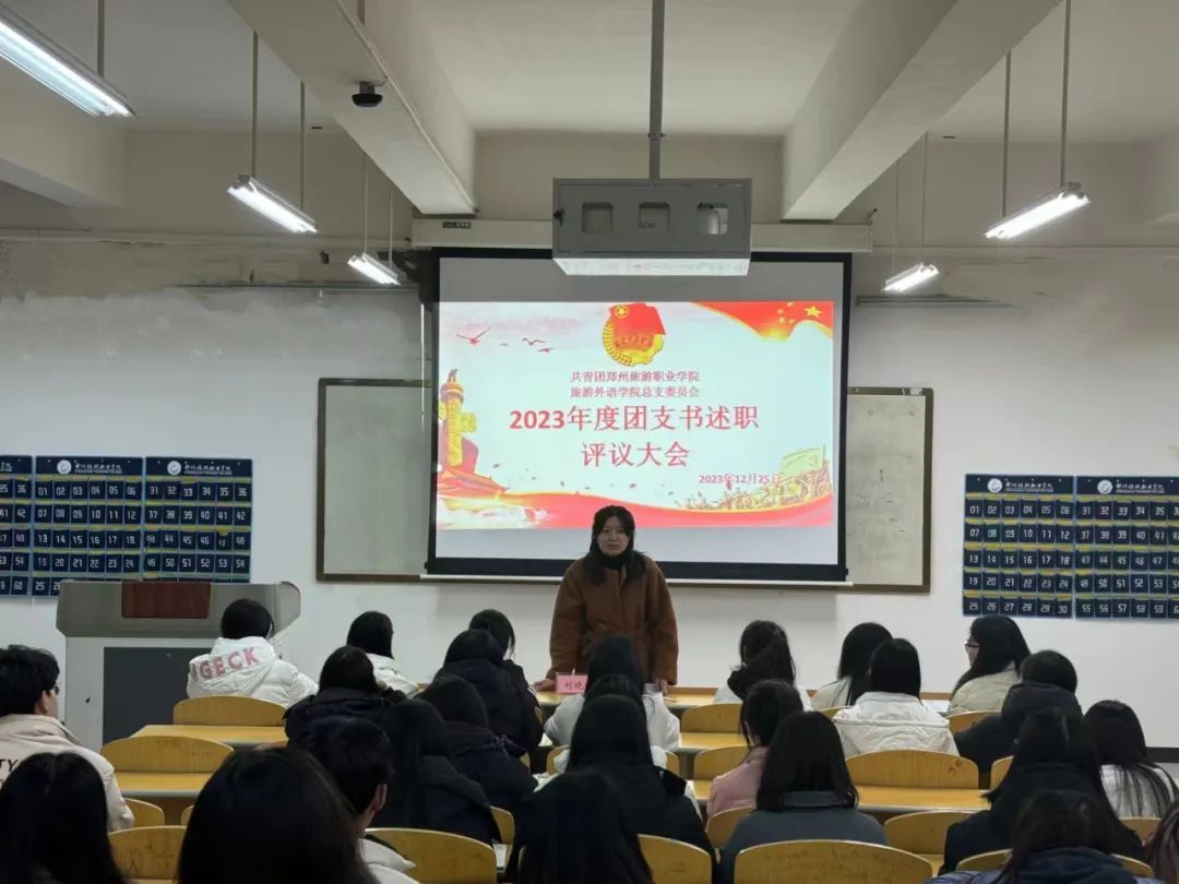 为指导推动各基层团支部加强建设、规范运行,不断提升组织力、凝聚力,2023年12月25日下午19时,旅游外语学院于4B211教室召开2023年度团支部书记述职评议大会。团总支书记刘晓丹、全体在校班级团支部书记,团干代表参加本次述职大会。本次大会由团总支组织部部长禹彩虹主持。