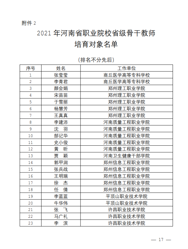 根据《河南省教育厅河南省人力资源和社会保障厅关于开展2021年河南省职业院校省级名师和省级骨干教师培育对象遴选工作的通知》(教职成〔2021〕319号)要求,经教师申请、学校推荐、专家评审、网站公示,我部张秋燕老师入选省级骨干教师培育对象。