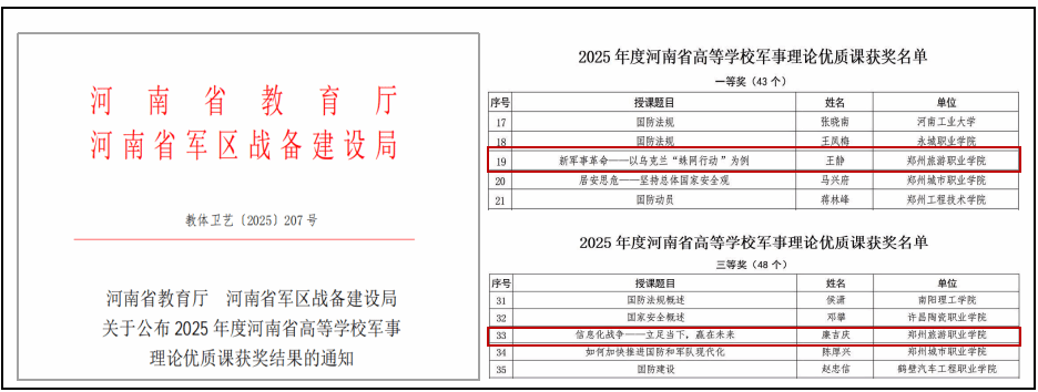 近日,河南省教育厅、河南省军区战备建设局联合公布了2025年度河南省高等学校军事理论优质课评选结果。在此次比赛中,海洋之神590登录入口马克思主义学院王静老师荣获一等奖,廉吉庆老师荣获三等奖,展现了海洋之神590登录入口教师在军事理论教学领域的扎实功底与卓越风采。