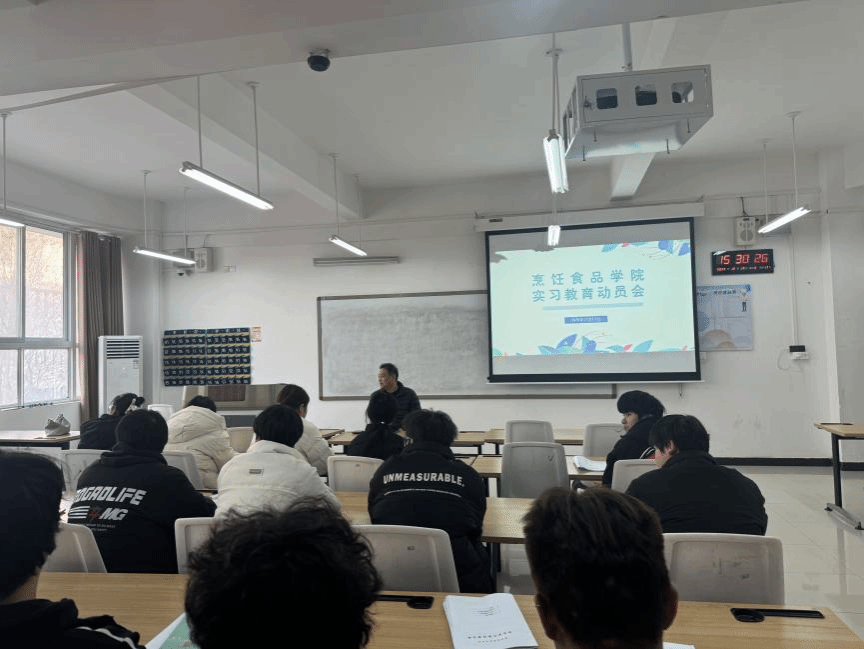 为扎实推进学生实习工作,强化实习期间的安全意识与责任观念,烹饪食品学院于2025年12月17日下午15:00在2B202教室组织召开2024级烹饪工艺与营养专业冬季实习生安全教育动员会。学院党总支书记田金毓、班主任及全体2024级烹饪工艺与营养专业实习生参加会议。