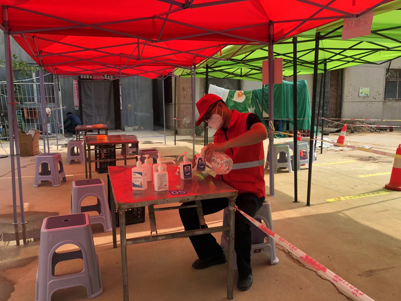 疫情未退,又逢端午。在很多人享受假期的轻松时,总有“红马甲”在各自岗位上忙碌着。6月3日,人事处弓建国老师又开始了这样的一天。他重新测量了核酸检测时地面的二米线距离,将大瓶的消毒液倒入方便瓶,一系列的动作熟练又潇洒。