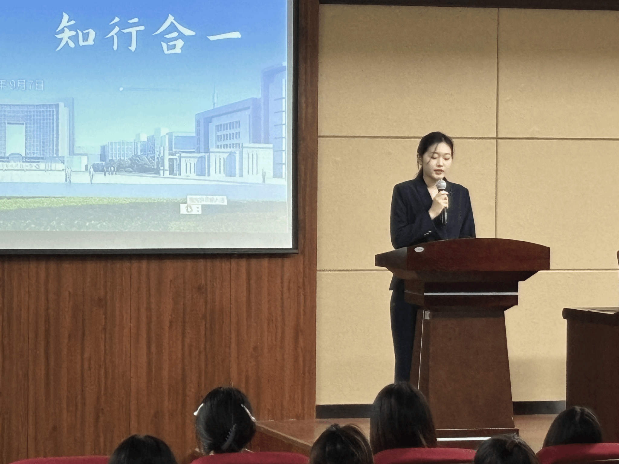 学生代表徐靖怡发言,她汇报自己的学习与暑期社会实践经历,分享了一年来的成长感悟,号召同学们在新学期一同勇于探索、脚踏实地,将知识转化为服务社会的实际行动。