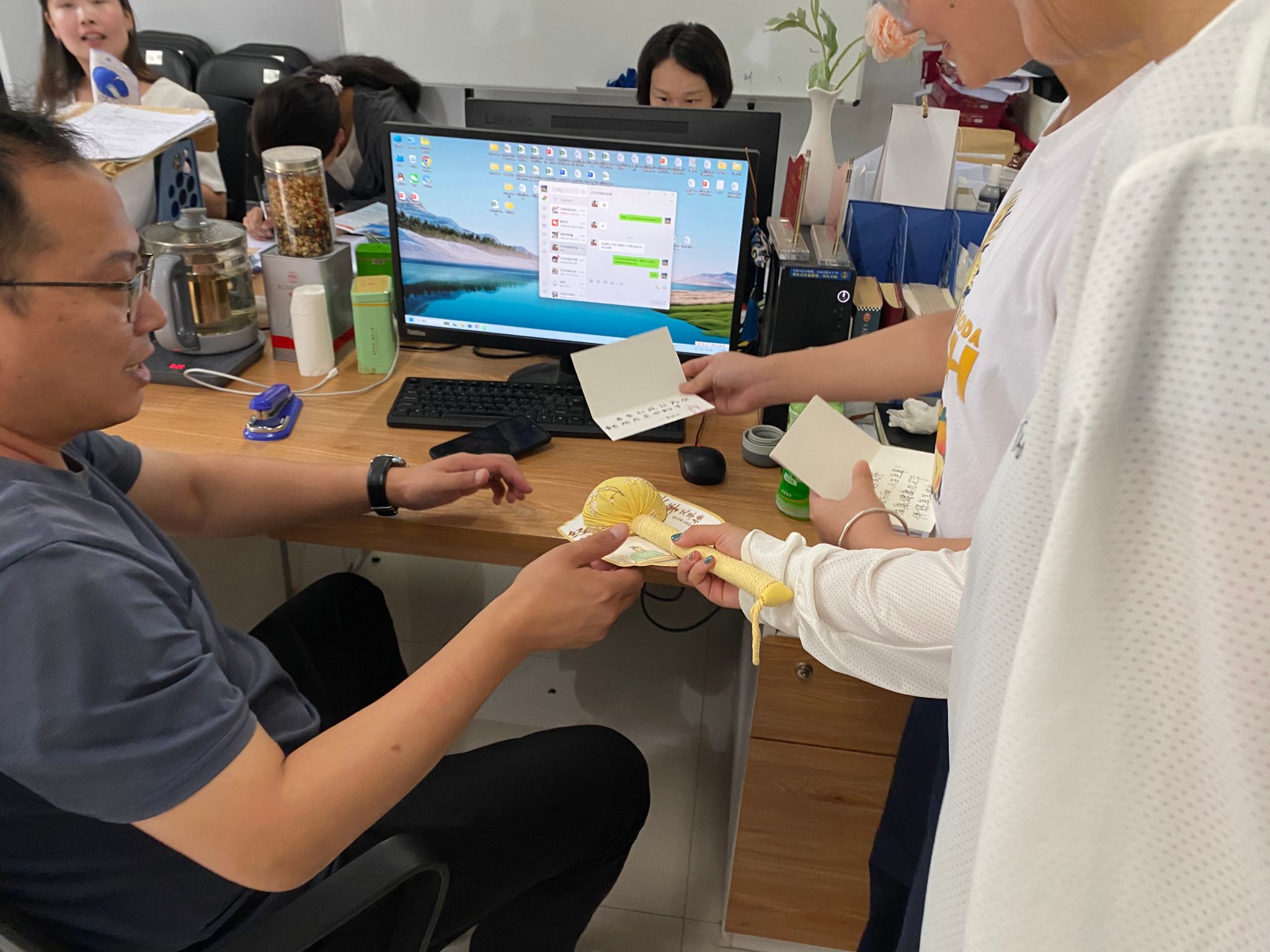 9月10日教师节上午,随着第一节课下课,智慧服务学院学团办干部代表化身“感恩使者”,手捧艾草锤与手写贺卡,向刚结束授课的教师们送上专属祝福,让短短几十分钟的课间成为节日里最暖心的片段。“老师,您站着讲了一节课,肯定累了!这个艾草锤您随时能捶捶肩颈。”在老师办公室里,学团干部双手将包装素雅的艾草锤递到老师手中,同时奉上字迹工整的贺卡。卡片上,既有“春晖四方,桃李天下;感谢您提灯引路,育梦成光”真切感恩。也有“三尺讲台,孕育桃李满园;一支粉笔,书写岁月春秋。”的真诚告白,字里行间满是师生相处的点滴感动。面对这份突如其来的惊喜,老师们纷纷露出笑容。