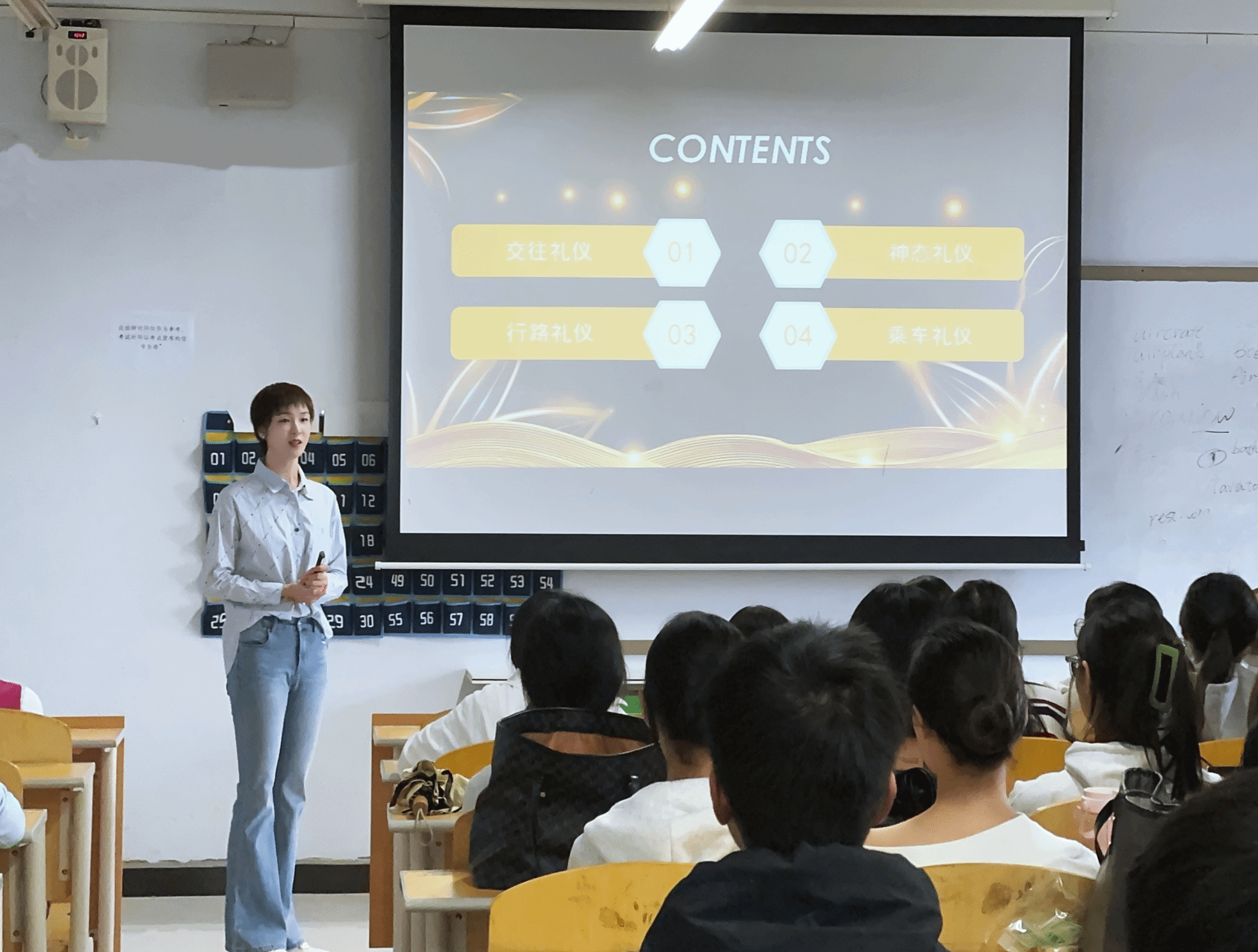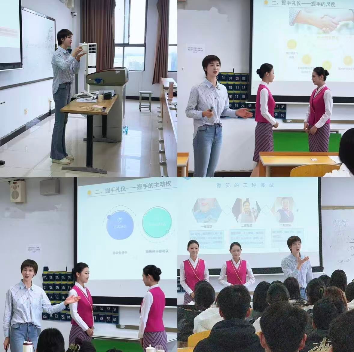 本次培训紧密围绕大会高规格服务需求,聚焦交往礼仪、神态礼仪、行路礼仪和乘车礼仪四大核心板块,涵盖接待流程、微笑管理、目光交流、奉茶规范、座次礼仪等关键内容。蓝圆圆老师依托其多年航空服务与礼仪教学经验,采取“讲演结合、情景模拟、分组互动”的方式,帮助学生快速掌握高端会展服务要领,强化了在实际服务场景中的应变能力与职业自信。
