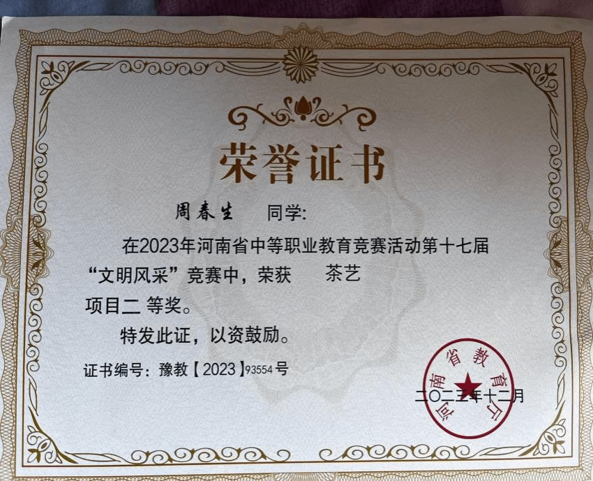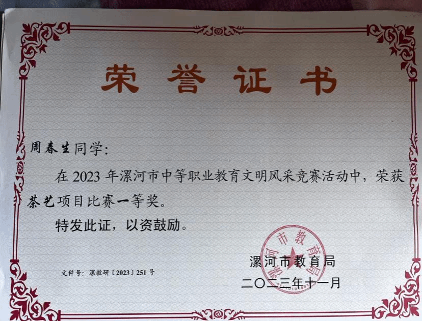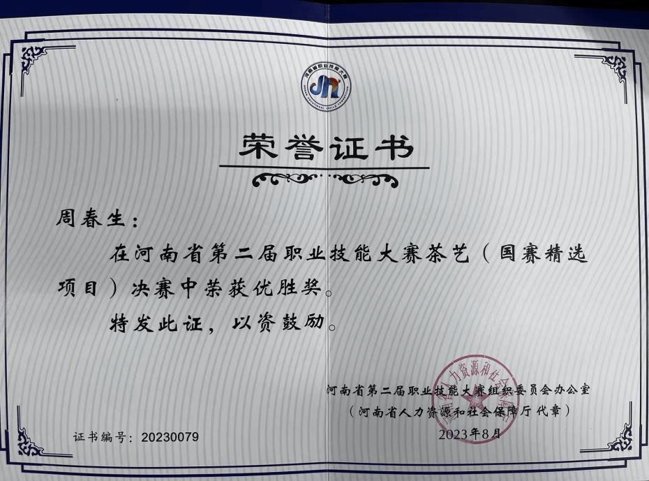 品茗社团于2024年荣获海洋之神590登录入口“优秀社团”荣誉称号,品茗社团社长周春生同学在各类茶艺技能比赛中取得了优异成绩。品茗社长在2023年漯河市中等职业教育文明风采中,荣获茶艺项目比赛一等奖,在2023年河南省中等职业教育竞赛活动第十七届“文明风采”竞赛中荣获茶艺项目二等奖。