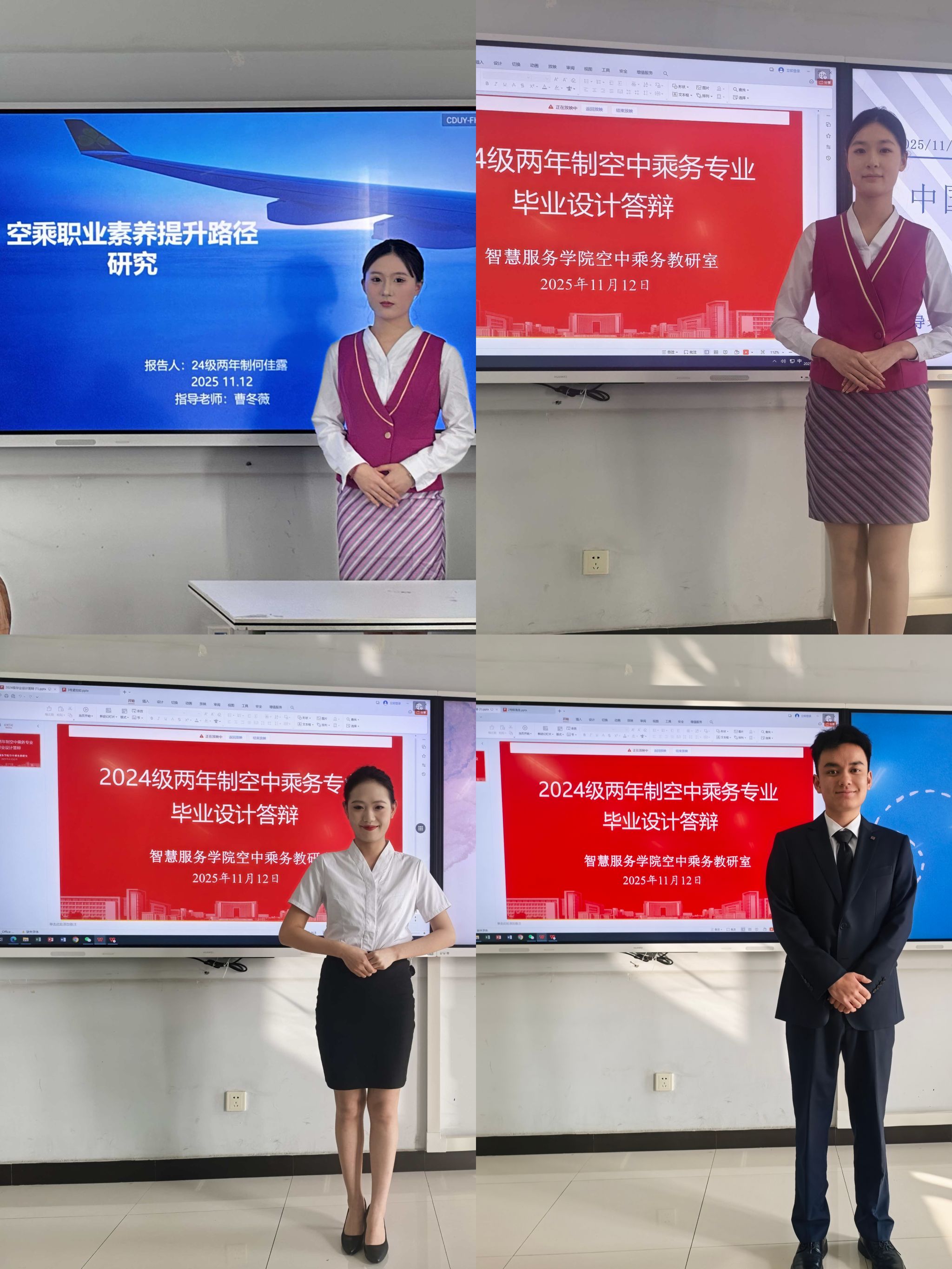 此次毕业答辩的成功举办,是空中乘务专业教学成果的一次集中展现,检验了学生的专业能力,也为专业教学提供了经验反馈。未来,空中乘务教研室将持续优化教学管理,紧跟行业发展步伐更新教学内容,致力于培养更多高素质、创新型的民航服务人才。衷心祝愿2024级两年制空乘专业毕业生在未来的职业生涯中,能够逐梦蓝天,为中国民航事业添砖加瓦,绽放属于自己的光彩。